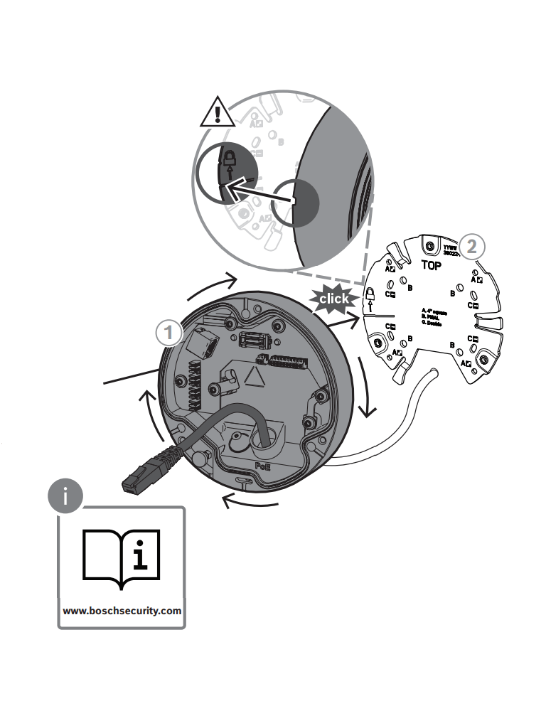 La NBE-7703-ALX utiliza el concepto probado de instalación de 3 pasos. La placa de montaje tiene múltiples patrones de orificios para su instalación en cajas eléctricas (cuadradas de 4 pulgadas y de doble salida) y en los accesorios universales de Bosch. La caja trasera se puede conectar con un simple giro y clic. Todos los cables se pueden conectar en la caja trasera.