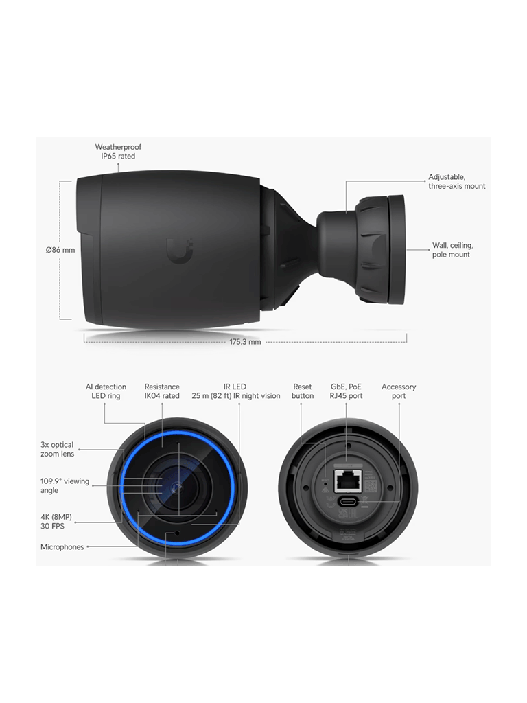 Cámara 4K Zoom óptico 3X IA avanzada: detecta personas lee matrículas IR 25 metros microfono integrado audio bidireccional Exterior Interior PoE+ (Color Negro) – UVC-AI-PRO