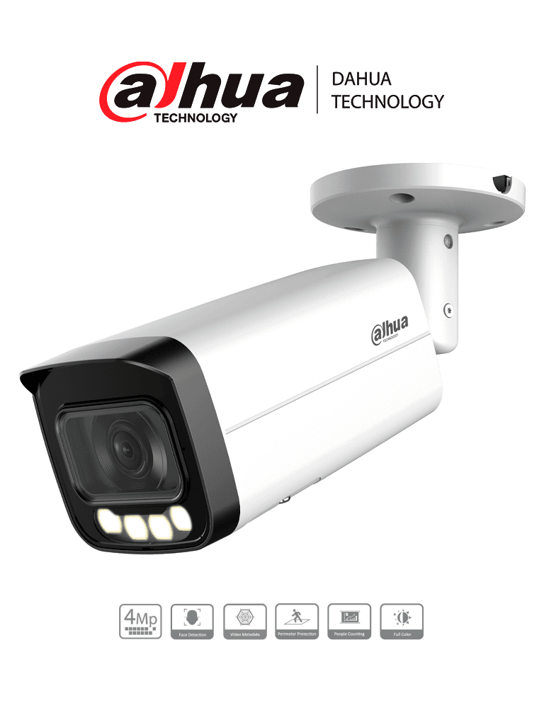 Cámara IP Bullet Full Color de 4 MP Lente de 2.8mm 40 m ir Micrófono Integrado Detección Facial Conteo de Personas Protección Perimetral SMD 3.0 e PoE IP67 E&S de Alarma Ranura para MicroSD Acu Pick – DH-IPC-HFW5449T-ASE-LED