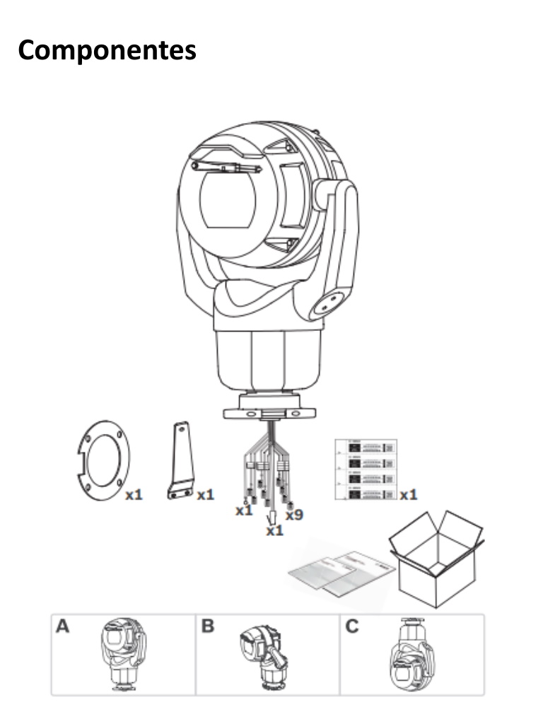 Opciones de soporte de montaje Cámaras MIC IP 7100i diseñadas por Bosch para su uso en aplicaciones de exterior. En un área de instalación cerrada (por ejemplo, en una fundición, cerca de un horno, etc.), las temperaturas exteriores a la cámara pueden superar los + 65 °C (+149 °F). Si instala una cámara en un recinto cerrado, asegúrese de que la temperatura de funcionamiento de la cámara es como máximo de + 60 °C (+ 140 °F). Asegúrese de que el aire circula alrededor de la cámara para proporcionar refrigeración. La figura siguiente identifica los soportes de montaje opcionales para las cámaras MIC. Consulte las hojas de datos de cada soporte en concreto para obtener más información. Algunos soportes pueden no estar disponibles en todas las regiones. |